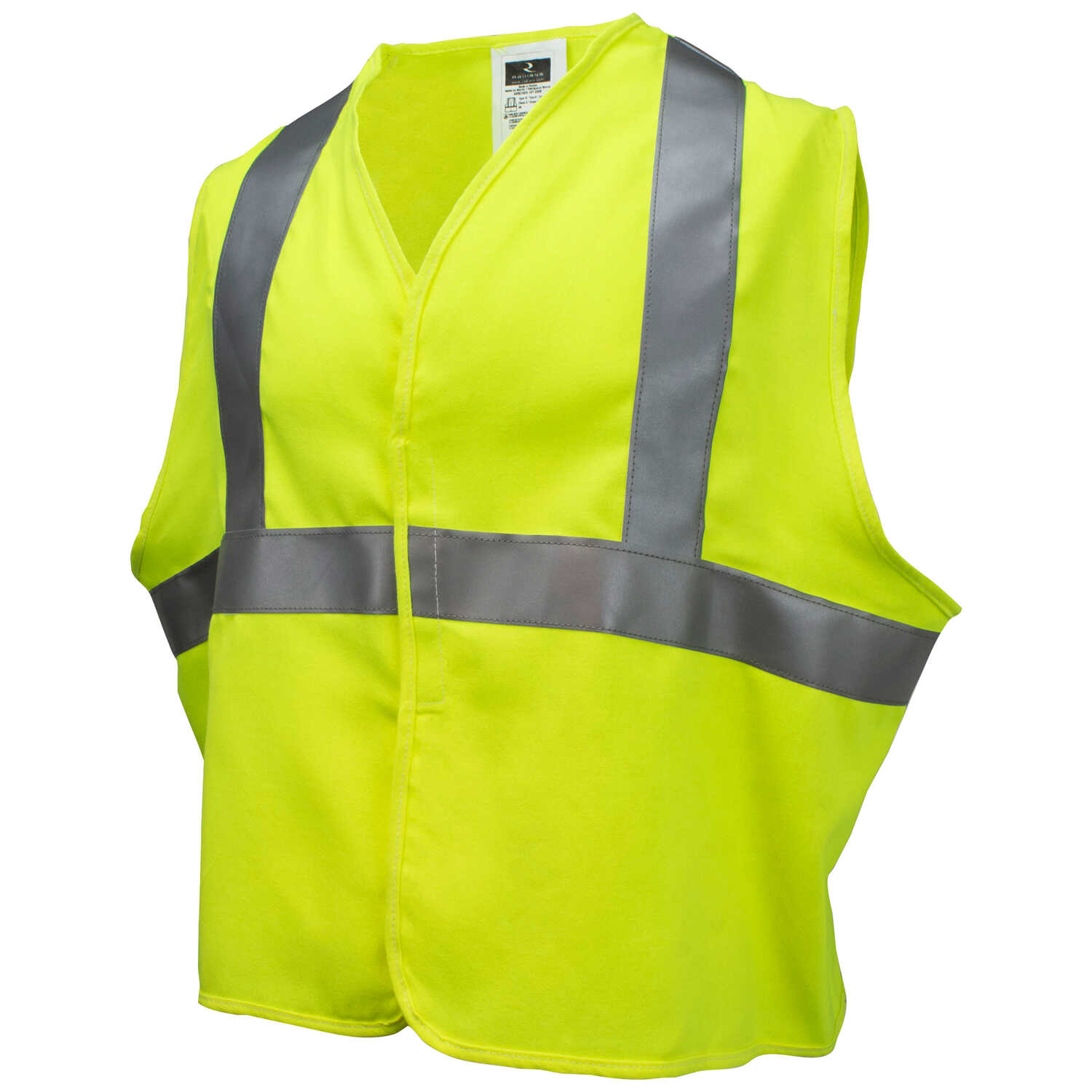 Designed for ultimate safety, this high-visibility vest also incorporates flame-resistant properties. Made of 5.5 oz. 95% Modacrylic and 5% Twaron materials, the vest features 3M Scotchlite FR reflective tape and a hook-and-loop closure. ANSI 107-2015 Level 2; ARC Rating 5.4 Cal/CM2; ASTM F1506. Meets and exceeds NFPA 1971, 2000 Edition, Sections 5-1.4 and 6.2.